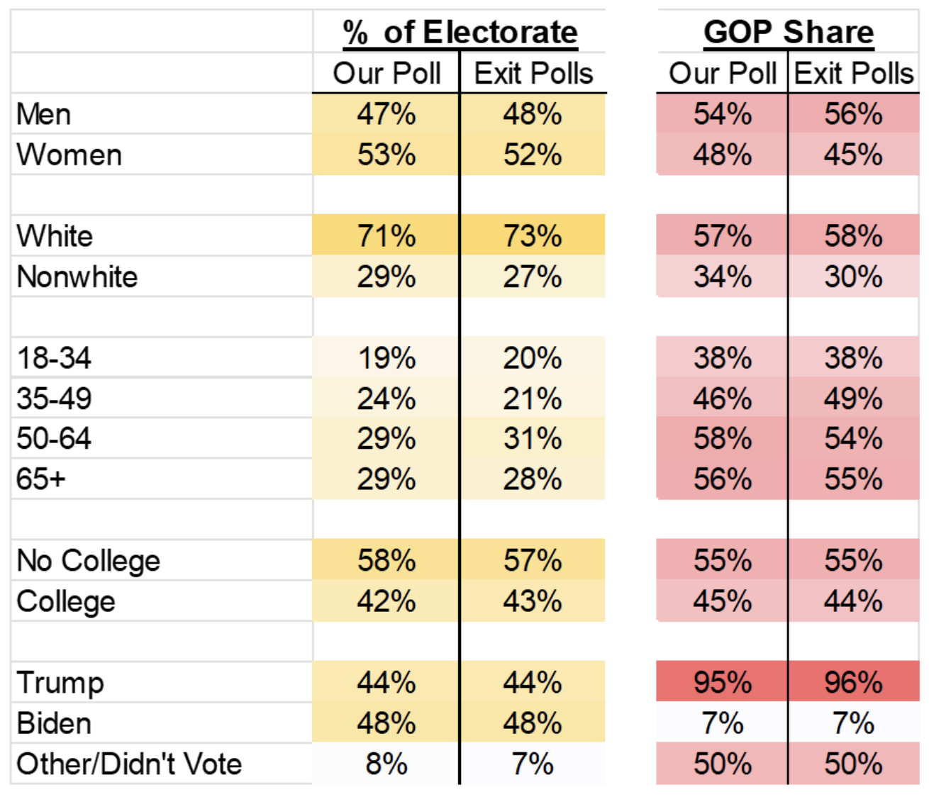 The chart below shows both our final national poll electorate against exit polling breakdown as well as the GOP two-party share against ours.