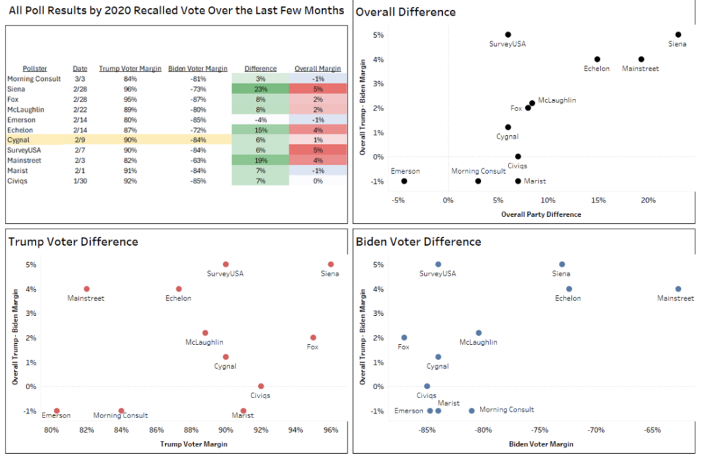 We’ll start with a list of recent head-to-head elections, and what stood out during our close study of the results was the recalled vote unity. Most of the current polling is Registered Voters, but even the Likely Voter makeups aren’t different enough to be the cause of the variance between polls – but this factor is. For polls that had crosstabs by the recalled vote, which asked a respondent who they voted for in 2020, we used it to make the table below.