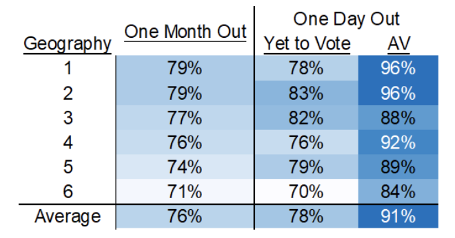 For Republicans, it means that you can’t rely on the numbers being inflated by Democratic crossover votes; instead focus on hitting Republican and Independent voter goals or else you will find yourself underperforming your final poll margin (again, why we have to pay attention to ballot share now more than in past elections).