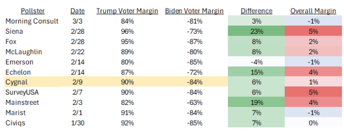 The Trump voter margin is how many people who voted for Trump 2020 are sticking with him again. Let’s say 90% in 2020 Trump voters were voting for Trump, which means currently 10% aren’t. That would give a value of 90 – 10 = 80%. The Difference column is how much more (or less in Emerson’s case) united Trump voters are behind him than Biden’s 2020 voters (shown with the same calculation but in an inverse number) are lining up behind him. The Overall Margin column is the head-to-head Trump vs. Biden margin.