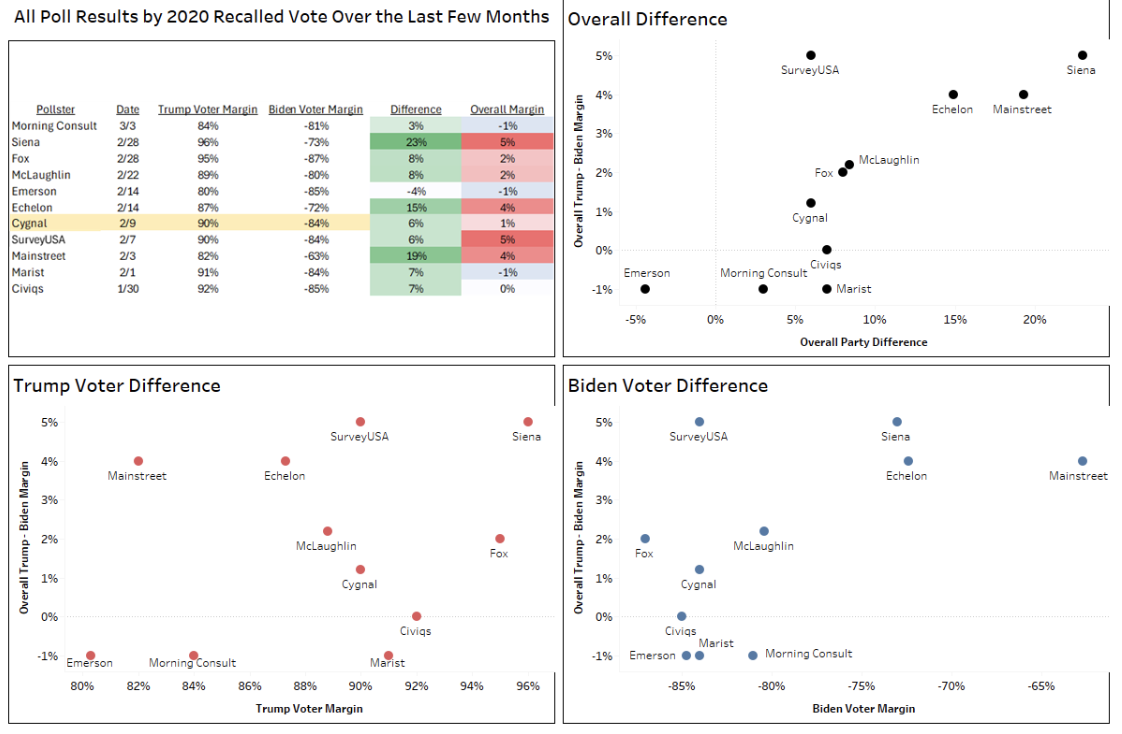 We’ll start with a list of recent head-to-head elections, and what stood out during our close study of the results was the recalled vote unity. Most of the current polling is Registered Voters, but even the Likely Voter makeups aren’t different enough to be the cause of the variance between polls – but this factor is. For polls that had crosstabs by the recalled vote, which asked a respondent who they voted for in 2020, we used it to make the table below.