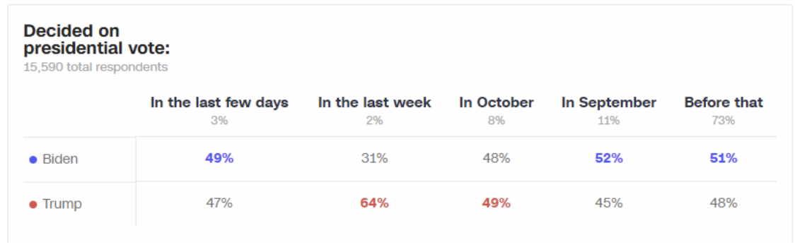 We in the industry make some assumptions on when people make up their mind. Some punditry mentions Labor Day before the election, pollsters switch to their likely voter (LV) screens usually around the conventions, and the CNN exit poll has about 5% of people in the last week of the election in 2020 and only a quarter starting in September.