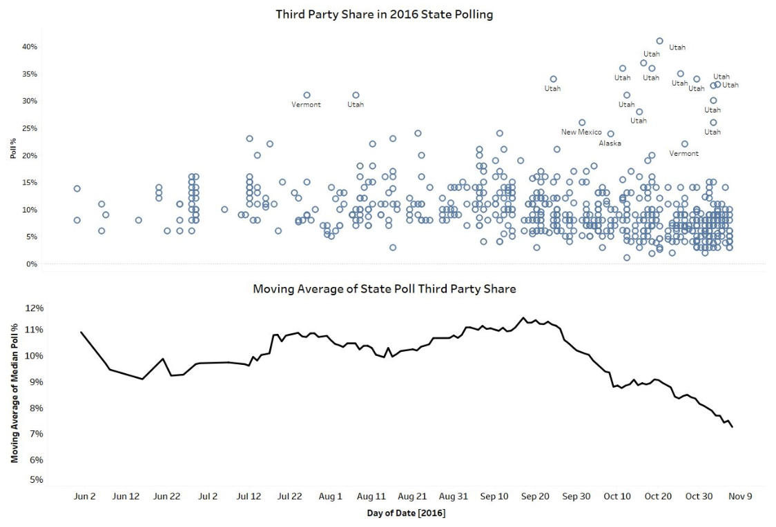There are other ways to measure when people get serious about their votes. In the chart below from 2016, the last time we had a presidential election with high-polling third parties, we see the reported share of the vote going to minor parties in state polls begin to drop rapidly by the end of September after being stagnant the whole time before. However, it didn’t really land on the accurate result until the day before the election.