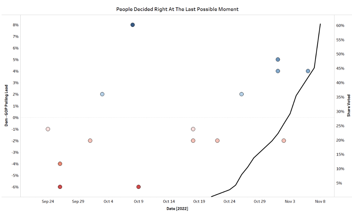 The next plot shows the dots of reach 2022 Oregon poll’s margin where the higher and bluer it is, the better for Democrats and vice-versa. The black line represents the cumulative votes counted on that day for the governor’s race with early voting, so there is a slight delay on when there were actual votes but paints a good picture on when voting happened. Republican leads didn’t get knocked down until the start of early voting, and the final polls themselves weren’t accurate until half of the people had voted, including the vast majority of Democrats.