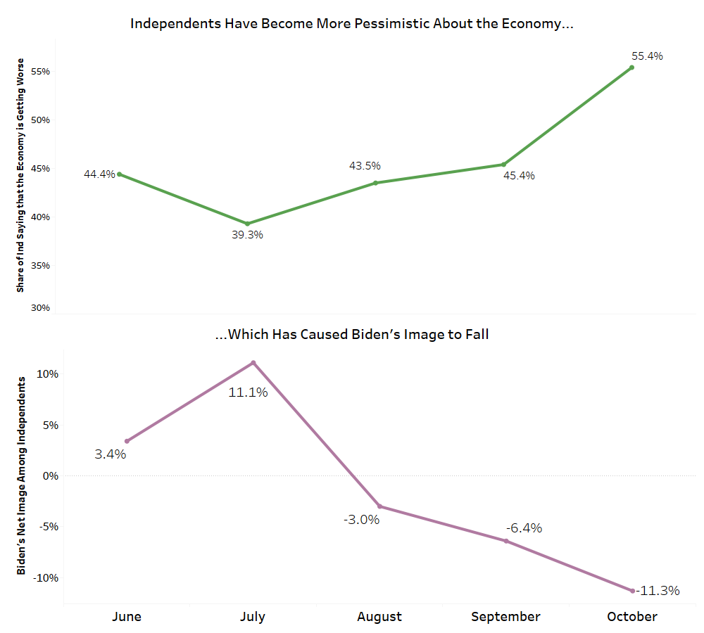 The chart below looks only at self-identified Independents, the largest swing group, and plots out their responses by month on whether they believe the economy is getting worse in the green line. Under that is Biden’s net image, which is the difference between his favorable number and his unfavorable number.