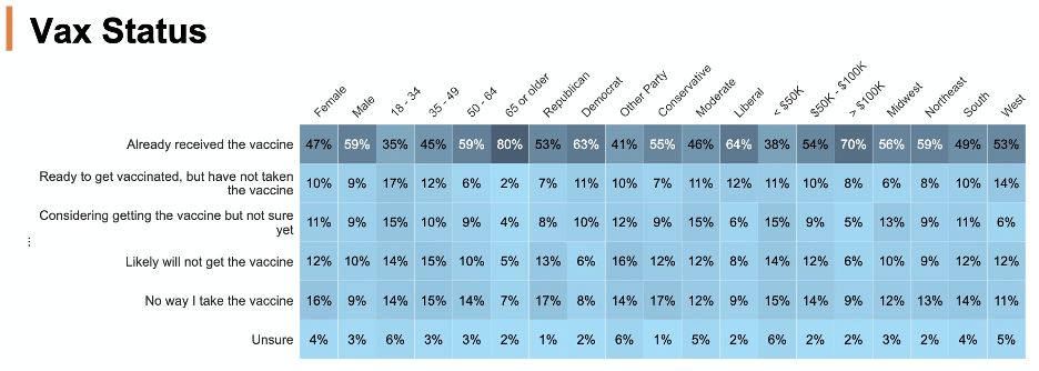 Based on our recent national survey of the general population, COVID-19 concern is on the downswing overall, and more Americans are starting to shift their focus to the economy. This is likely spurred on by successful vaccination efforts–over half of American adults have been vaccinated against COVID-19, and another 20% are ready for immunization or at least considering it.