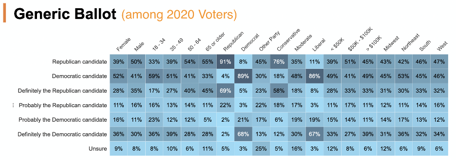 And you don’t have to take our word for it–the proof is in the pudding of the generic ballot results. Republicans who voted for Biden in 2020 are now R+18 (54% R / 36% D), and among those who voted in the 2020 presidential election, the generic ballot is only D+1.4. We see some of the same trends as pre-pandemic American politics, such as the significant gender disparity in partisanship and younger voters trending Democratic, but new patterns are emerging as well.