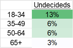 This group is likely to break more towards Republicans, choosing them 44% / 18% (+26%) on the generic congressional ballot, similar to the 42% / 24% (+18%) lead for Trump over Biden in the recalled vote. Governor Whitmer has a 21% / 69% (-48%) favorable image and Dixon is at 22% / 50% (-28%) among undecideds and third party voters so opposition is also not as high to her, but the higher third-party voting intention makes more sense. The below table shows the share of each age group that is undecided in the gubernatorial are and it is younger voters that are up for grabs while 97% of seniors have picked either Whitmer or Dixon.