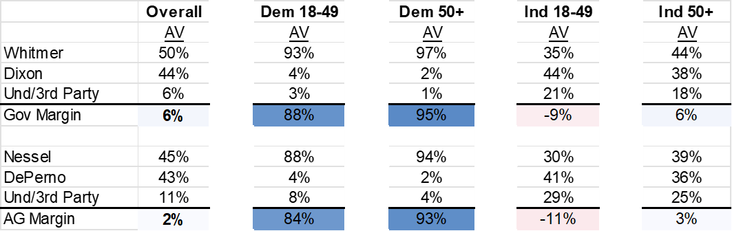 Whitmer is just below the 50% mark with a 5-and-a-half-point lead over Dixon (though that will probably shrink as we’ll talk about in the next section), and the generic ballot holds steady at R+2. Incumbent Secretary of State Jocelyn Benson also has a seven-point lead of 48% / 41%, but in the Attorney General race, Dana Nessel only leads 45% / 43% (+2%). The table below shows that some of this is a higher undecided number for Democrats but also more undecideds with Independents too. As partisans return home, and without the actual third-party number being higher, it would not be surprising to see this margin wind up similar to the other statewide candidates.