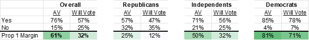 For respondents within each party, those that have already voted are much more likely to have supported Proposition 1, especially a shift among Independents. This is in good shape to pass and if voters keep breaking this way, pass by a very, very large margin.