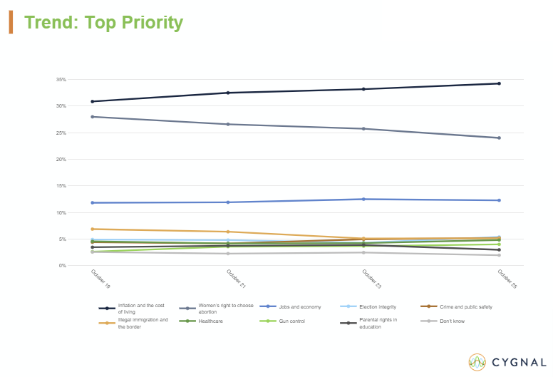 Whitmer runs well ahead of Biden overall on the topline but when Republicans actually go to the ballot, they may be lining up behind their nominee. This means Whitmer must hold her strength up with Independents or softer partisan voters up through Election Day, and she can’t take that lead for granted. Nessel is also running well behind the other named Democrats but among those who vote, she is catching up. The other real change over time has been voters’ top priorities where abortion has begun to fade in favor of economic issues.