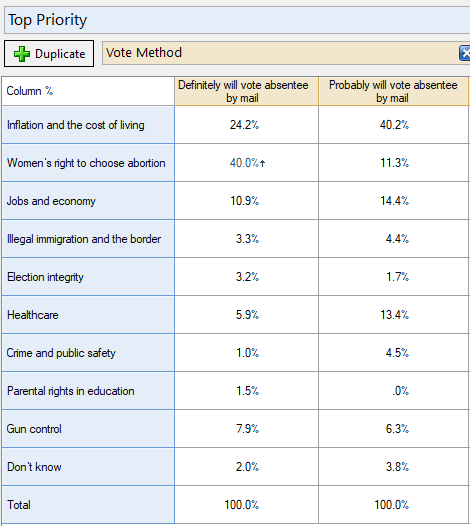 Abortion is still a big driver for those who have yet to early vote (mostly younger Democrats) but isn’t a motivator for those on the fence about early voting. The crosstab below displays the breakdown among all voters, where 40% of those who have yet to vote by mail have this as the top issue, but they’re already likely to show up. It drops to only 11% among those on the fence about voting absentee, and inflation is a much bigger issue.
