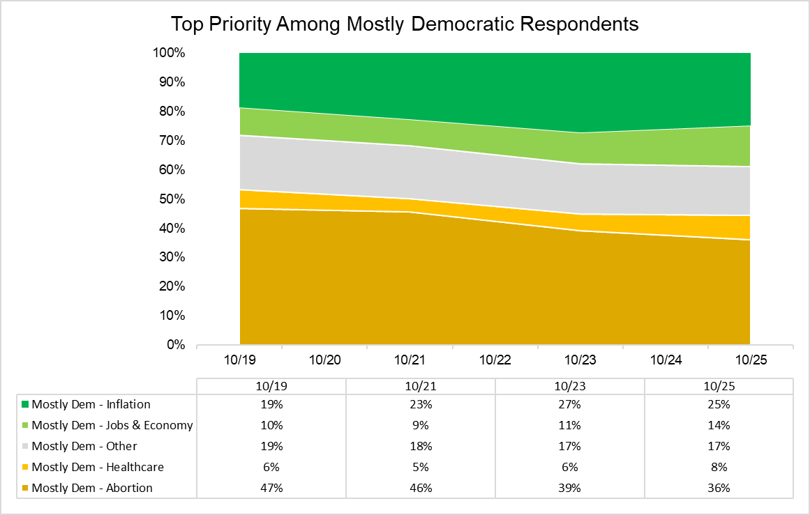 The driver for this is Democrats, specifically those answering that they were mostly Democratic instead of strong Democratic. The chart below shows that the economic issues of inflation and jobs have seen rises since last week, while the right to choose an abortion has dropped. Among men, the drop was a bit higher, but you can see they moved more to healthcare.