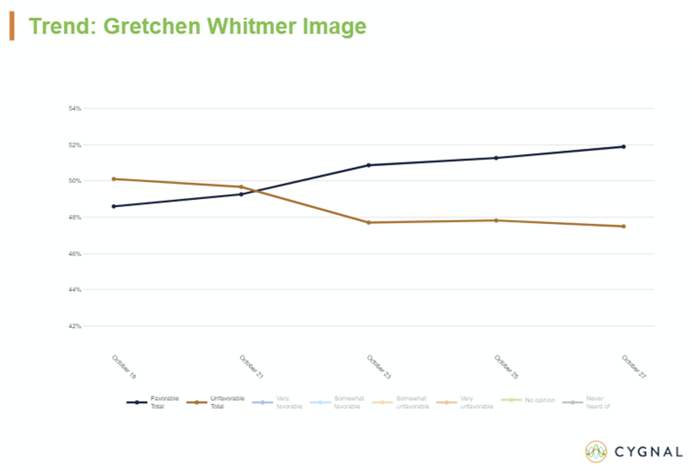 With Cygnal’s Momentum tracking poll in Michigan, we’ll be releasing data every other business day. The next round will be released Monday, Oct. 30. Want to learn more about our new tracking poll methodology? Discover all the ins and outs of Cygnal Momentum here.