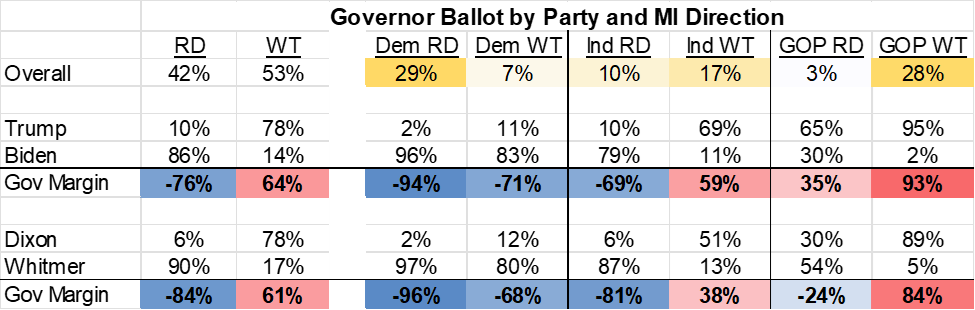 One reason for Whitmer’s lead has been a dual ability to keep Democrats in line and peel off voters that agree with how she is running the state. The chart below shows the 2020 recalled ballot and Whitmer’s margin by whether a respondent believes that Michigan is heading in the right direction and then broken out by party: