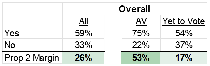 Between Democrats becoming more supportive and Independents possibly reading more about Prop 2 and backing it over the standard status quo bias, it seems possible that support could grow from the current number, but it will likely at least hold its 59% with a very good chance of passing.