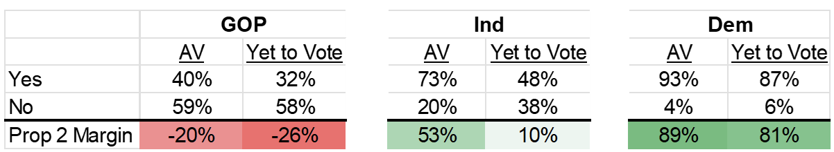 Seeing the margin among those who have voted can be a good proxy of an informed voter on these complex issues because people will usually do a little bit of research beforehand, even if it’s just light googling. A quick search of Proposition 2 shows not many partisan indicators though some Republicans have begun to air ads (or some out against it) recently over voter ID law changes. The Detroit Chamber of Commerce has endorsed it however, so there might be a split on the right in support, and it shows up where strongly Republican voters oppose this at a 29% / 64% (-35%) margin compared to the mostly Republican margin of 38% / 54% (-16%). The chart below compares each party’s support by already voted and outstanding votes.