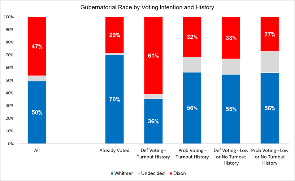 While Governor Whitmer holds a 3 to 4-point lead, we can see a few different turnout scenarios potentially happening (and the higher the turnout, the more Whitmer extends her lead). We see why in the chart below which shows the margin by whether a respondent has voted already, whether they definitely or probably plan to vote, and if they have a history of turning out in midterms.