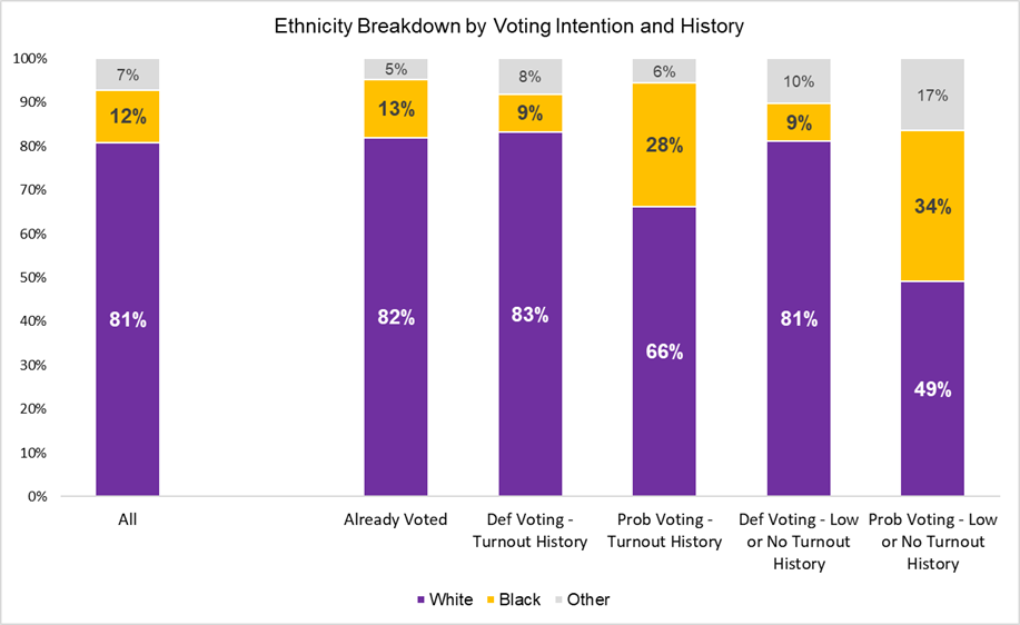 A lower turnout election would take into account the very large Democratic lead among early voters, and then put the definitely election day voters on top of that with a handful from the other groups. But as turnout increases, it picks up more from the Whitmer-friendly universes of those who are newly registered or usually presidential year voters, as well as those saying they are only probably voting. The other big factor is Black voter turnout. Detroit clerk Janice Winfrey is expecting a very large drop in Black voter turnout and in our polling, we also see how precarious it is. Of course, clerks miss on turnout all the time, and this should not be taken as a guarantee, but we took the universes above and looked at the breakdown by ethnicity in the chart below.
