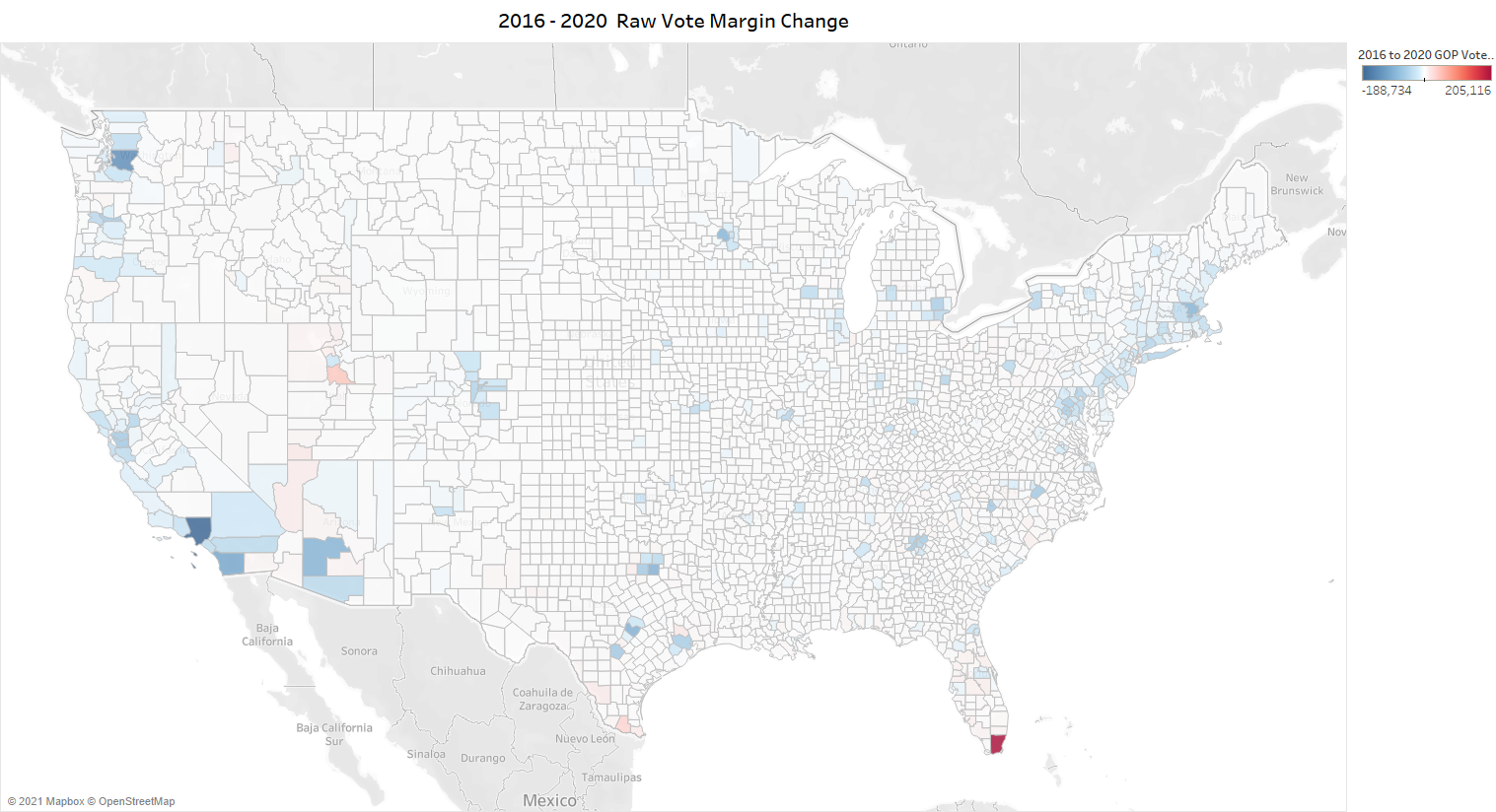 Margin doesn’t show the whole story, and it really comes down to the vote totals. It’s why we included the following map showing the change in the raw vote margin change since 2016. Blue counties like Los Angeles or the area around Denver show where Democrats added the most net votes while red counties, such as Miami, show where Trump gained the most net votes.
