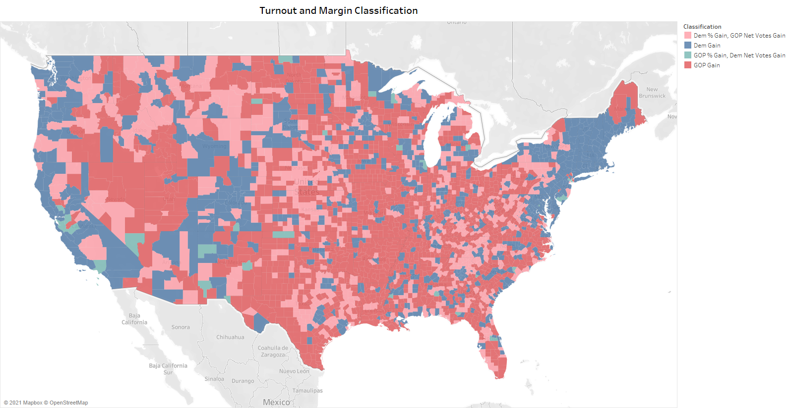 Democrats made big gains in the cities and all along the Beltway in the diagonal line in the Northeast, while Republican net vote gains are clearer in Miami, Southern Texas, and Utah county. Now let’s combine the two in the map below. Here, counties are divided up into one of four categories: