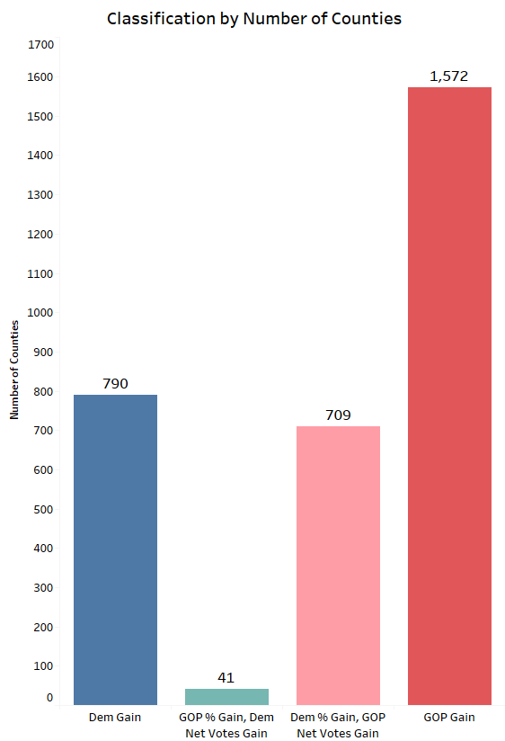 The chart below shows the total number of counties that fit into these classifications, and while Democrats made a percent margin gain in nearly half of the counties overall, they only really netted votes from about 25%. The rest saw such high turnout that, even though they nudged to the left a little bit, Trump was able to get more net votes from half the counties that moved towards Democrats this time around than he did in 2016.
