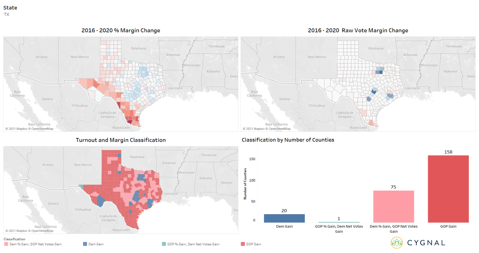 For one to explore these counties up close, Cygnal has created an interactive dashboard where you can select a state and see the margin change, raw vote change, and the classification of the counties on a map and in the totals. Hover over a county to see the name and all the relevant shift numbers.