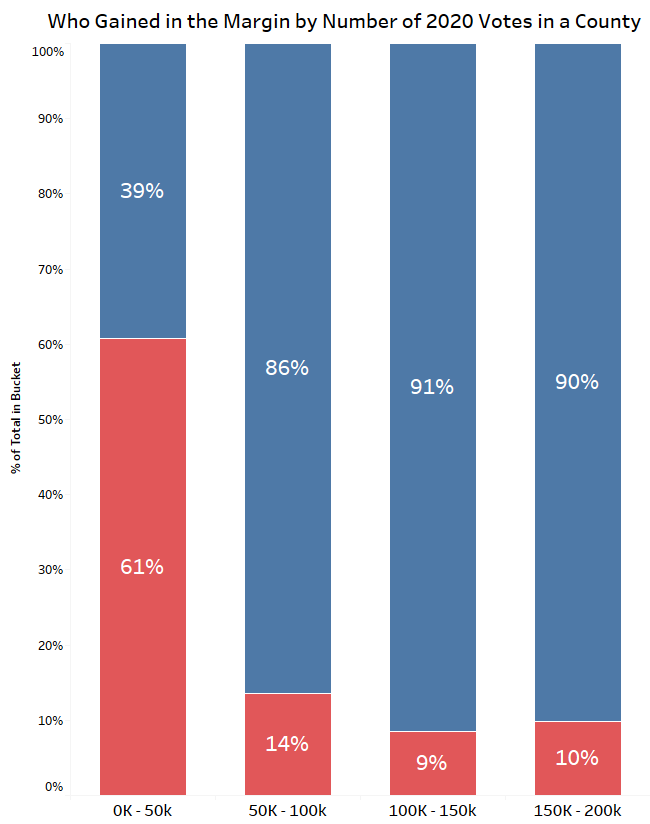 One thing that stuck out was how many Democratic counties in smaller, more rural counties seemed to shift to the left but gave Republicans more votes during this cycle. Below is a chart that breaks up the smaller counties into buckets based on how many votes there were in total in 2020, and it shows which party made gains by percentage. The blue means that the margin shifted to the Democrats, and red means that it moved towards Republicans.