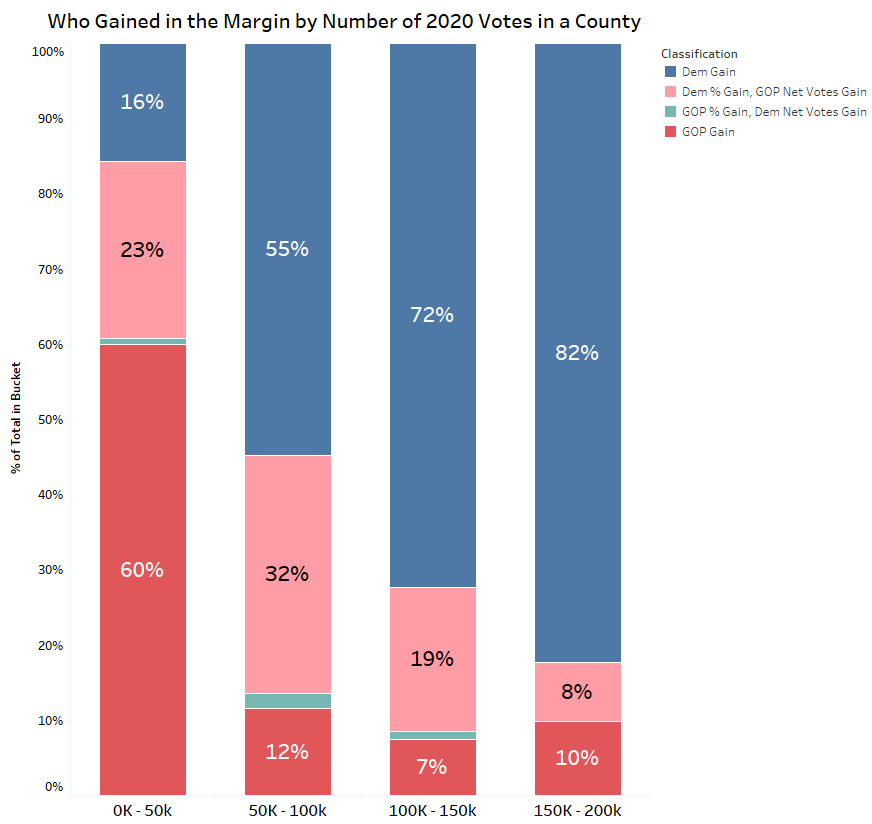 Several gains in the counties that had between 50k and 150k votes may have shifted to Democrats in the margin but actually netted Trump more votes. Democrats did better as the number of people in a county increased. This looks a lot different than the flat 90% rate as the previous chart. Over half of the smallest counties, where Democrats gained in the percentage, still saw Republican’s net votes.