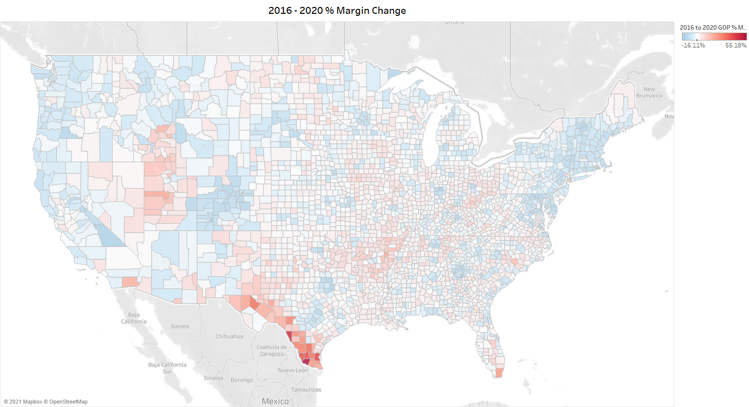 Dark Red: Republicans gained in the vote share margin and net votes. This happened mostly in rural counties but also in places like Southern Texas and Southern Florida.